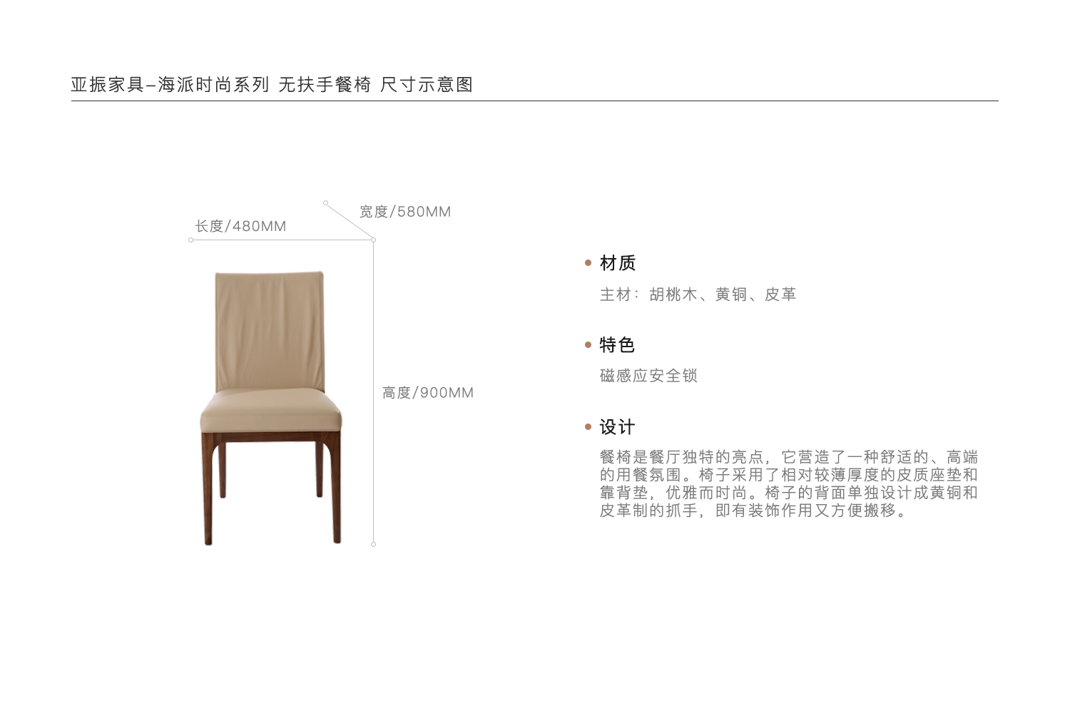 餐椅是餐厅独特的亮点,它营造了一种舒适的、高端的用餐氛围。椅子采用了相对较薄厚度的皮质座垫和靠背垫,优雅而时尚。椅子的背面单独设计成黄铜和皮革制的抓手,即有装饰作用又方便搬移。