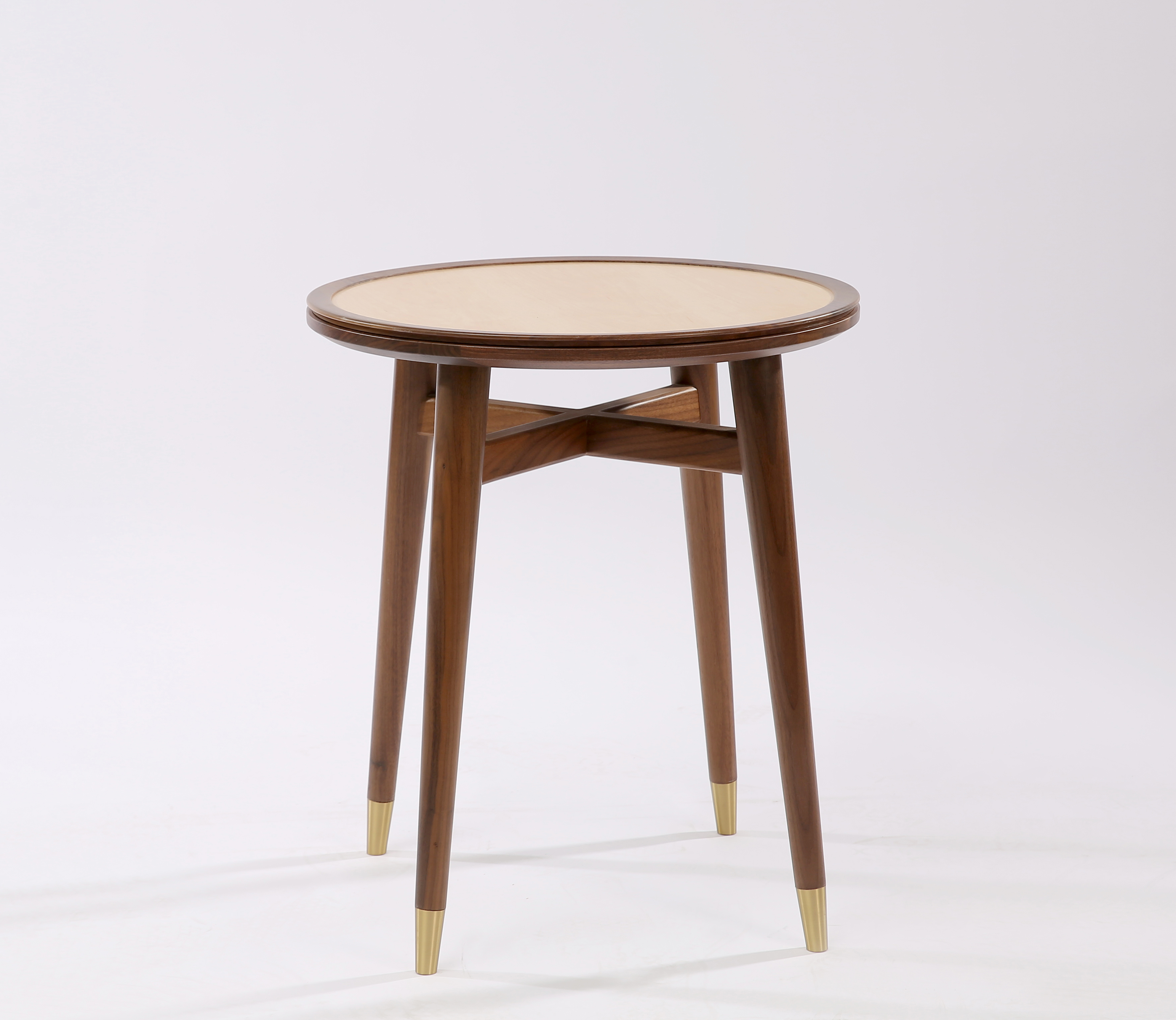 边几风格为后现代风格。边几的脚部与餐桌相得益彰。采用胡桃木制作,托盘为枫木材质。顶部的托盘为可移动茶盘,使用功能性强。