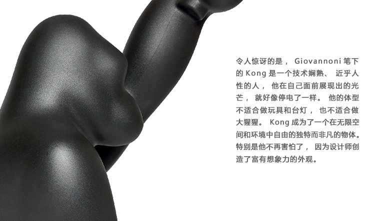 令人惊讶的是,Giovannoni笔下的Kong(金刚)是一个技术娴熟、近乎人性的人,他在自己面前展现出的光芒,就好像停电了一样。他的体型不适合做玩具和台灯,也不适合做大猩猩。金刚成为了一个在无限空间和环境中自由的独特而非凡的物体。特别是他不再害怕了,因为设计师创造了富有想象力的外观。