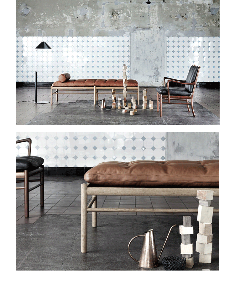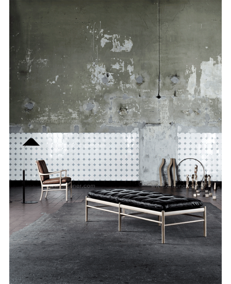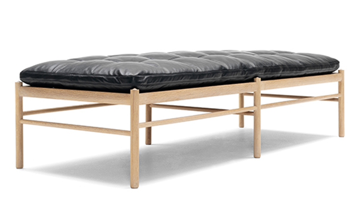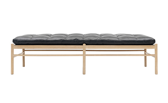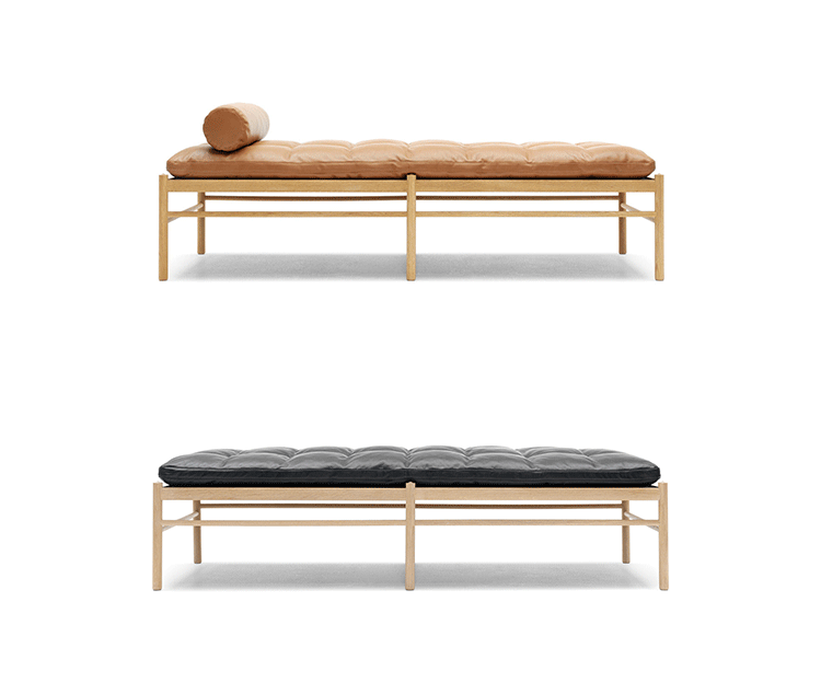 "OW150 is a timeless and elegant daybed with simple forms finished to the very highest standards.Slim dimensions and resilient forms are haracteristics of Ole Wanscher's designs.Classic and yet singularly modern at the same time.The seat is made of hand-woven stretched cotton webbing in black,attached to a solid wood frame.The cushions consist of down molded cold foam,upholstered in your choice of fabric or leather.Matching neck pillow is also included.Cushion is not turnable."