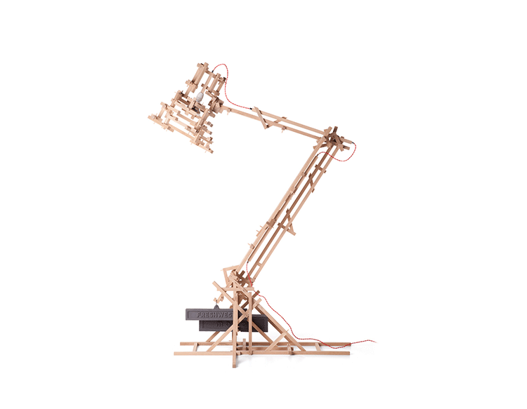 "in a brave new world imagination is free to produce a complex lamp with simple materials, translating the warm soul of the oak wood in a mechanic way.""the brave new world lamp by design duo fresh west started as a concept piece of random thought-initiated construction. Following the example of old far eastern bamboo scaffolding or simply of our childhood meccano creations, the brave new world lamp was developed without a design or plan in place. Nevertheless each piece of wood is carefully notched and pegged together to form an integral part of the overall mechanical structure." Material: Oak frame and cast iron balancing weights"