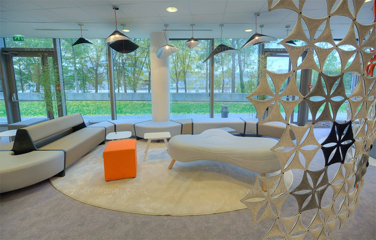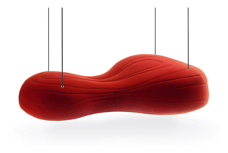 不规则的、变形的沙发形式允许创造一个不寻常的公共空间。这些模块是用木制的腿,小的隐藏的腿,这样沙发看起来就像是直接躺在地上,或者悬挂在绳子上,给人一种漂浮在空中的感觉。设计的主要特点是有可能在功能和外观方面提供不同的基础。这些座椅有两人位和三人位型号可供选择。