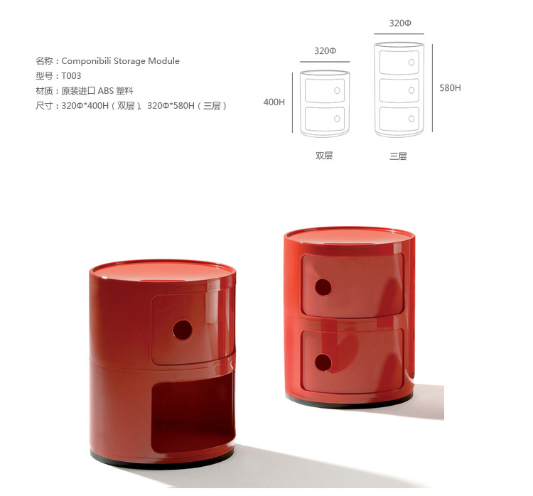Componibili Storage Module(意大利圆形储物柜)是由意大利著名建筑师安娜·卡斯特利·费里尔(Anna Castelli Ferrieri)作品,以期符合各式室内空间所需的收纳要求。不论是置於卧室、客厅、浴室,或是厨房等。都可以轻易融入空间设计之中,带给您最大的收纳机能。圆形设计,在最小的立足点下,即可轻易摆放。问世近40年以来,已成為极受欢迎的经典设计作品。
