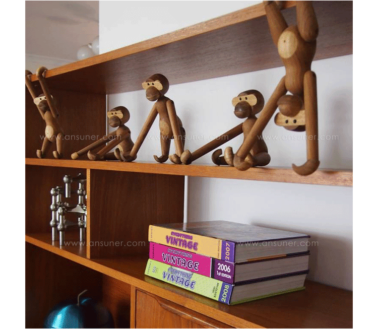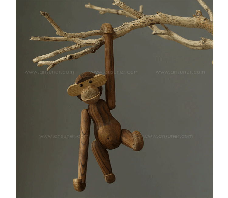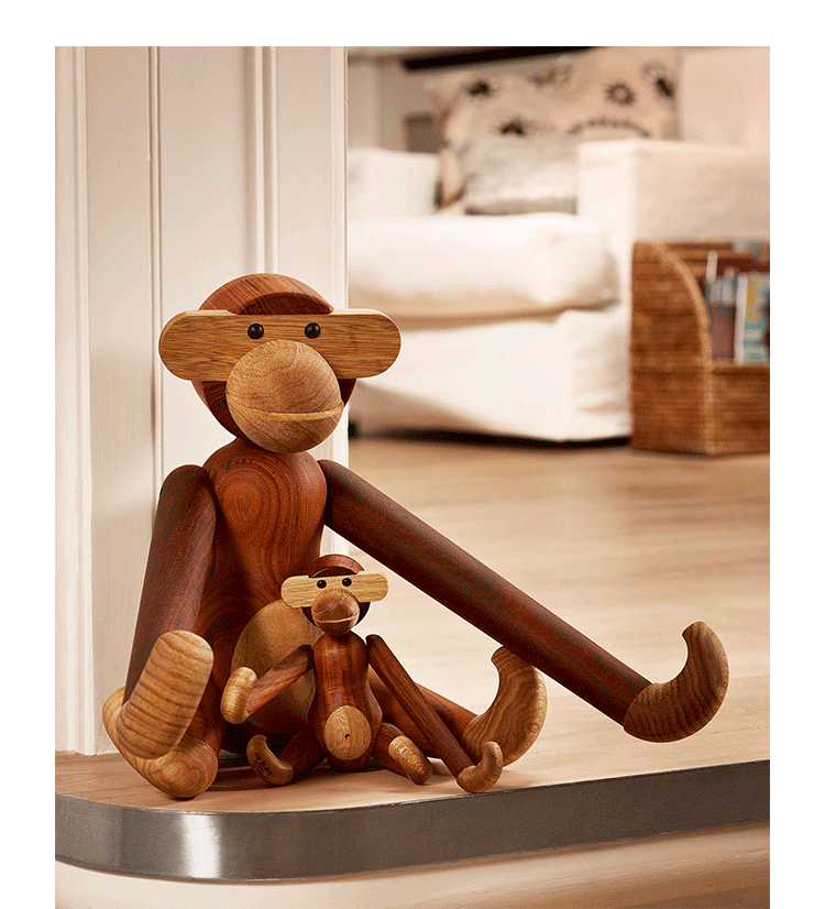 Kay Bojesen Monkey(Kay Bojesen 猴子)出自丹麦设计大师 Kay Bojesen 的设计作品,设计于1951年,精致的木制动物系列,是 Kay Bojesen 为人熟知的珍藏作品系列,采用不同的橡木、枫木、柚木等原木素材,保留木材的独特纹理,刻画出各种不同让人莞尔一笑的动物姿态,跳脱生活中的烦琐与紧张,简单的玩偶,轻松的神情,带您回归孩时的天真与简单快乐。精致而限量珍藏的作品系列,适合您作为桌面摆设,或是作为送礼小物,分享您生活中的快乐写意。可爱的小猴,可摊坐、吊挂树上、摇晃走路等,自在摆出您喜爱的完美姿态。英国著名杂志 Wallpaper,曾一次摆出 50 只不同姿势的猴子,带动您的全面想象和创造力。