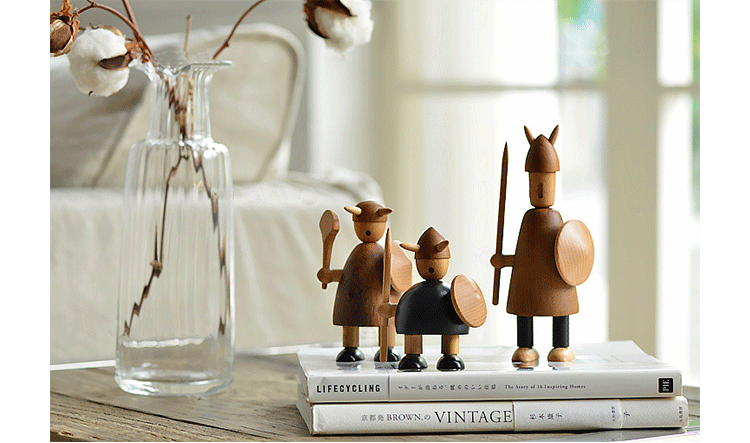 由于50年代的丹麦活跃着一股「斯堪地那维亚现代主义设计」风潮,延续低调简洁的风格并大量采用自然木材与传统工艺所迸出的美丽火花,设计大师Jacob Jensen也致力其中成为见证历史的大师之一。Jacob Jensen Wooden Viking(维京海盗)是经典的北欧形象,随着《加勒比海盗》系列电影的风靡,维京海盗在骁勇彪悍的传统形象里增加了俏皮、温暖、幽默的一面。这一组维京海盗形象为主题的北欧木雕设计,正是基于如此可爱的解读而做,摆在桌面上形成了饶有趣味的场景感,也是用来赠送的高档礼品。