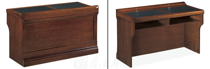 ※  全木制结构条形桌,桌脚可做直形及弧形,下设空格储物空间,内嵌式皮垫写字板,麦克孔,满足不同需要;
