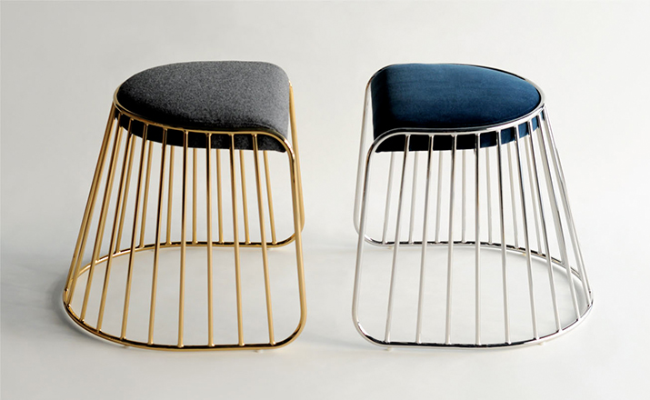 "The Bride's Veil Stool family’s unique language is meant as a graceful alternative to the archetypal stool.The strikingly elegant metal base is available in smoked brass, polished chrome,burnt copper,or powder coat,while the top is offered in COM upholstery.At every angle these stools offer a visual treat."