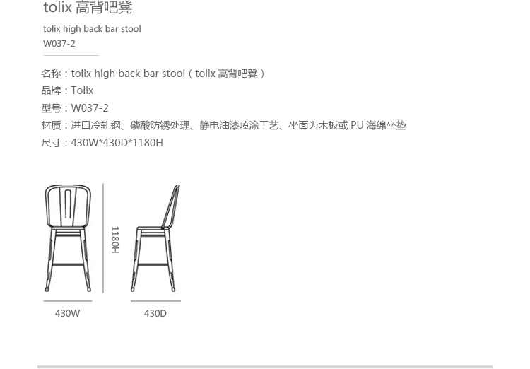 tolix chair(tolix椅)一把有味道、有态度的椅子,据说它最开始被使用在一艘战舰的天气预报房间里,故事的真实性与否不得而知,但是不影响其成为享誉世界的著名设计家具,1934年由Xavier Pauchard设计,早期是作为户外用家具设计,力图展现法式慵懒而闲适的气质,经年而来被全世界时尚设计师所宠爱,从室外扩展到家居、商业、展示等多个用途,而此椅也不负众望在各类空间中均有上佳表现,特别是近年来与混搭、乡村、美式、怀旧、北欧简约、中式等主要装修风格搭配,都呈现出独特的韵味,也被时尚界赞为“百搭第一”椅,可以用在酒吧,餐馆,咖啡馆等等地方,之后通过改进,设计出有扶手版本的tolix armchair(tolix扶手椅),高背版本的tolix high back bar stool(tolix高背吧凳),宽背版本的tolix wide back bar stool(tolix宽背吧凳),及tolix bar stool(tolix吧凳)和tolix mini stool(tolix迷你凳)。制作采用进口冷轧钢、磷酸防锈处理、静电油漆喷涂工艺、坐面为木板或PU海绵坐垫,颜色可选。