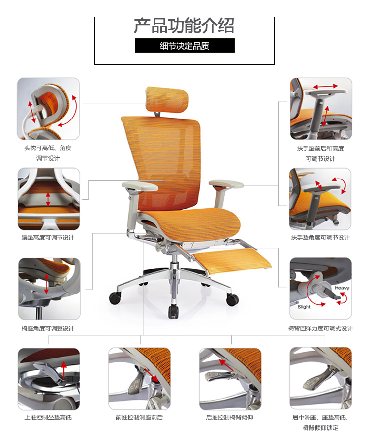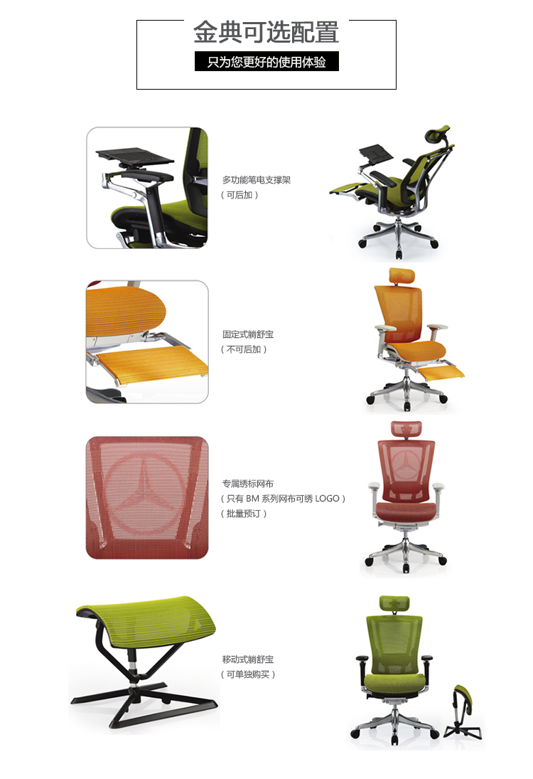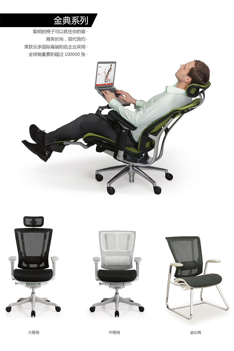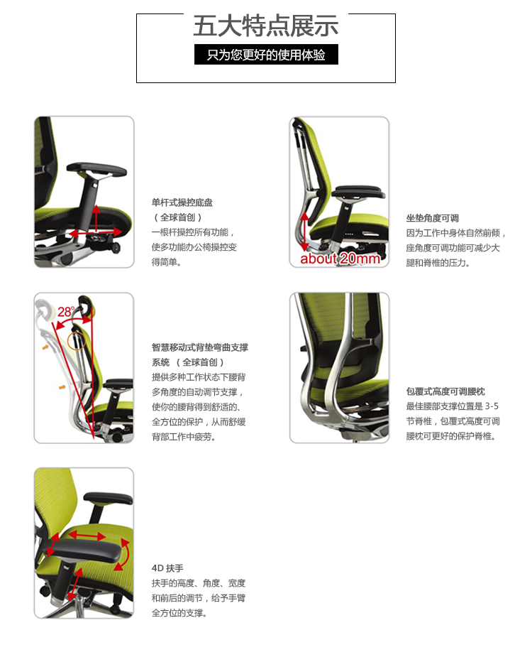 人性化背垫弯曲支撑系统,坐下时因个人体型需要自动改变椅背与腰部角度,聪明的移动,抓住你的背,提供最舒适的支撑;人性化背垫弯曲支撑系统,工作中因个人的工作姿势,不断改变椅背与腰的角度,聪明的移动,抓住你的背,使使用者的背永远获得最舒适的支撑;人性化背垫弯曲支撑系统,后仰时因个人体型椅背做最大角度变化,使用者的腰与背仍在聪明的移动下,获得最舒适的支撑.