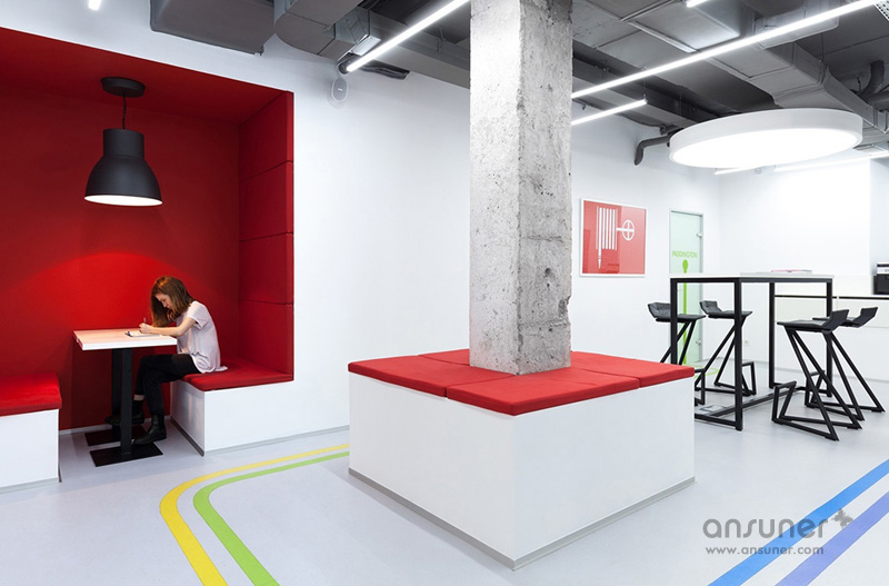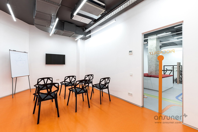 Underhub是乌克兰基辅本地的一家现代语言学校,同时这里还兼做联合办公空间,设有共享工作区、会议室和休息区。本案的设计灵感来自伦敦的地铁环境设计,将靓丽的导向色彩引入到室内设计中。如此充满创意的设计构想来自于基辅本地的一位才华横溢的建筑设计师 Emil Dervish。