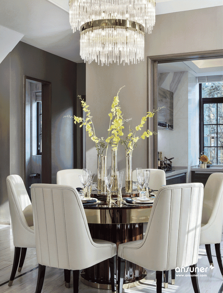 客厅整体空间为浅色系,线条简洁硬朗,象牙白的背景色,奠定了空间低调的质感、优雅的基调。设计师采用大量高级皮质材料,巧妙搭配自然质感的石材以及金属元素,璀璨的金色和几何经典,给予色彩最大的礼赞。流光溢彩的水晶吊灯尽显奢华,恰如一个浪漫的音符,赋予空间生动轻灵的魅力。
