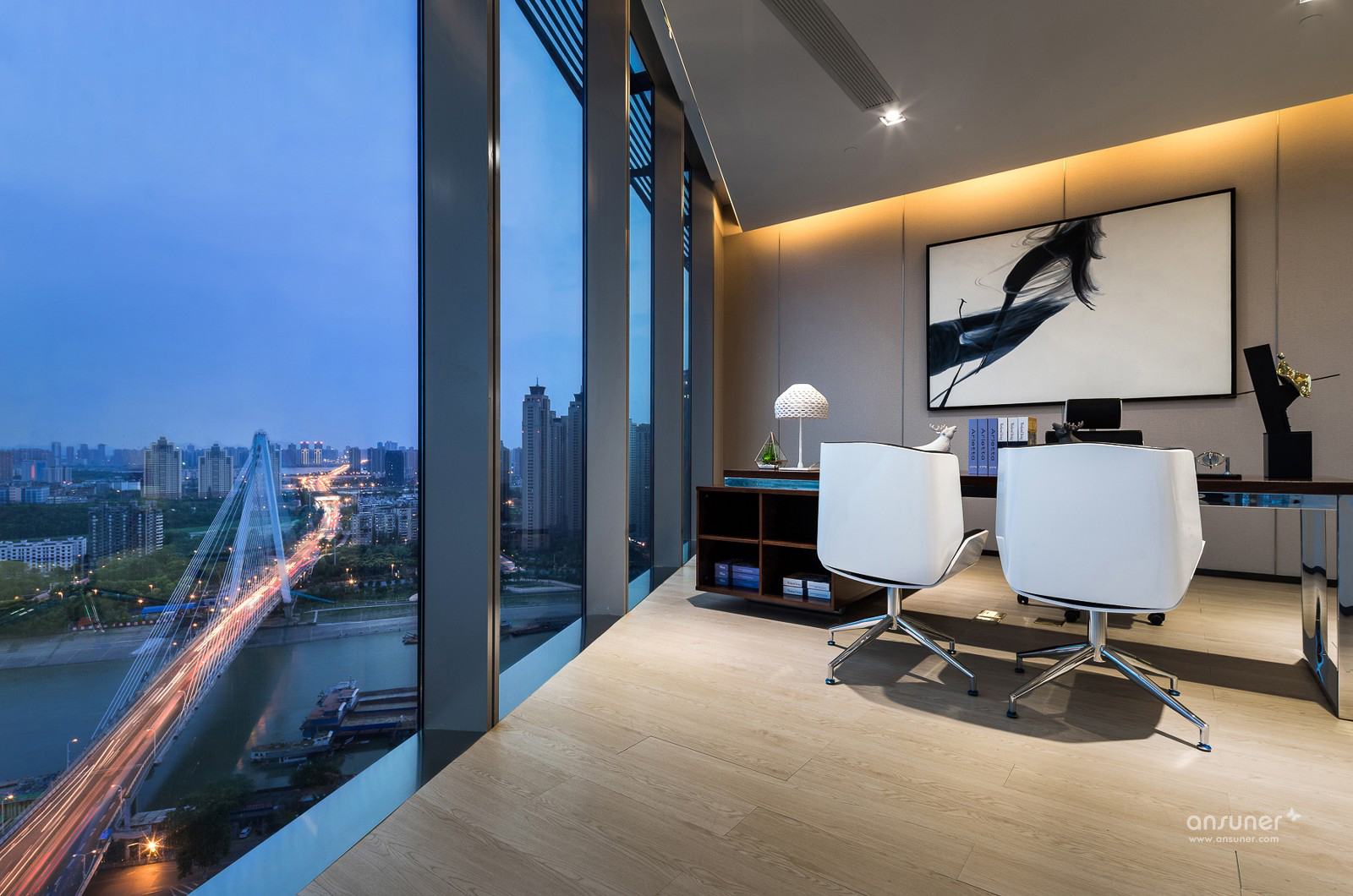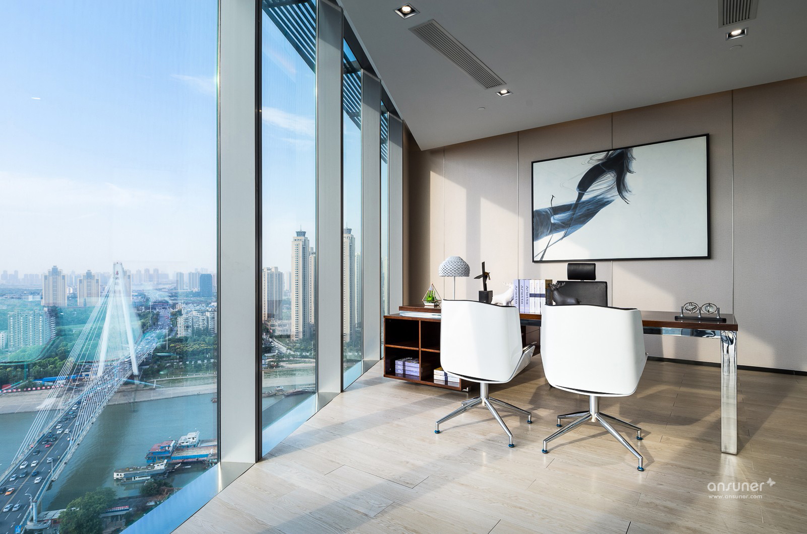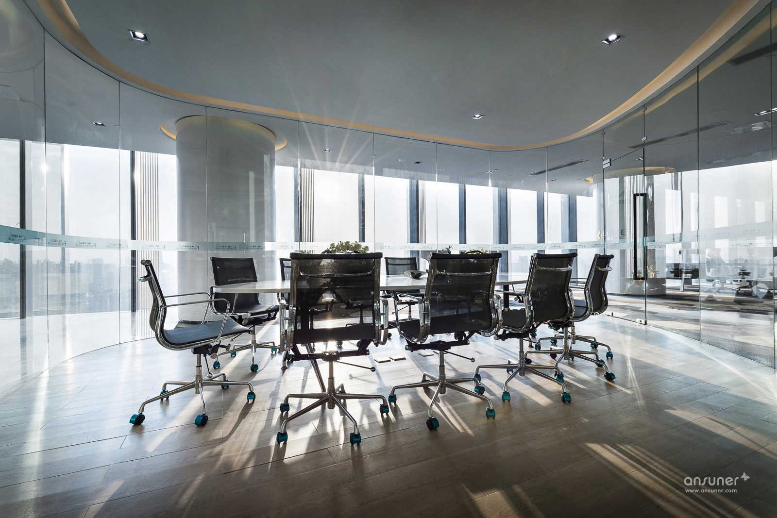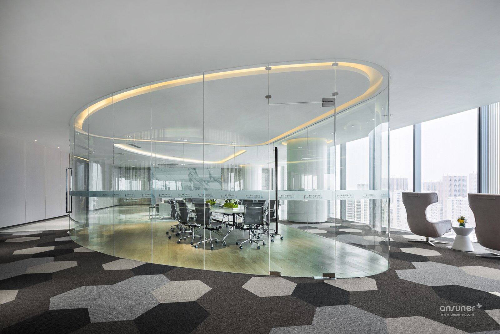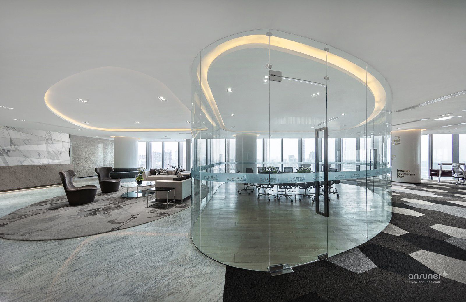 武汉越秀财富中心为华中地区位居第三的高楼,总高330米,地处武汉汉口核心地段,内环线西顶点,承武广,临汉江,居百年大道一中山大道之源。项目位于22楼的办公示 范间,为营造一个既开放又相对独立的办公空间,设计以黑、白、灰为主色调,空间以圆弧玻璃划分。