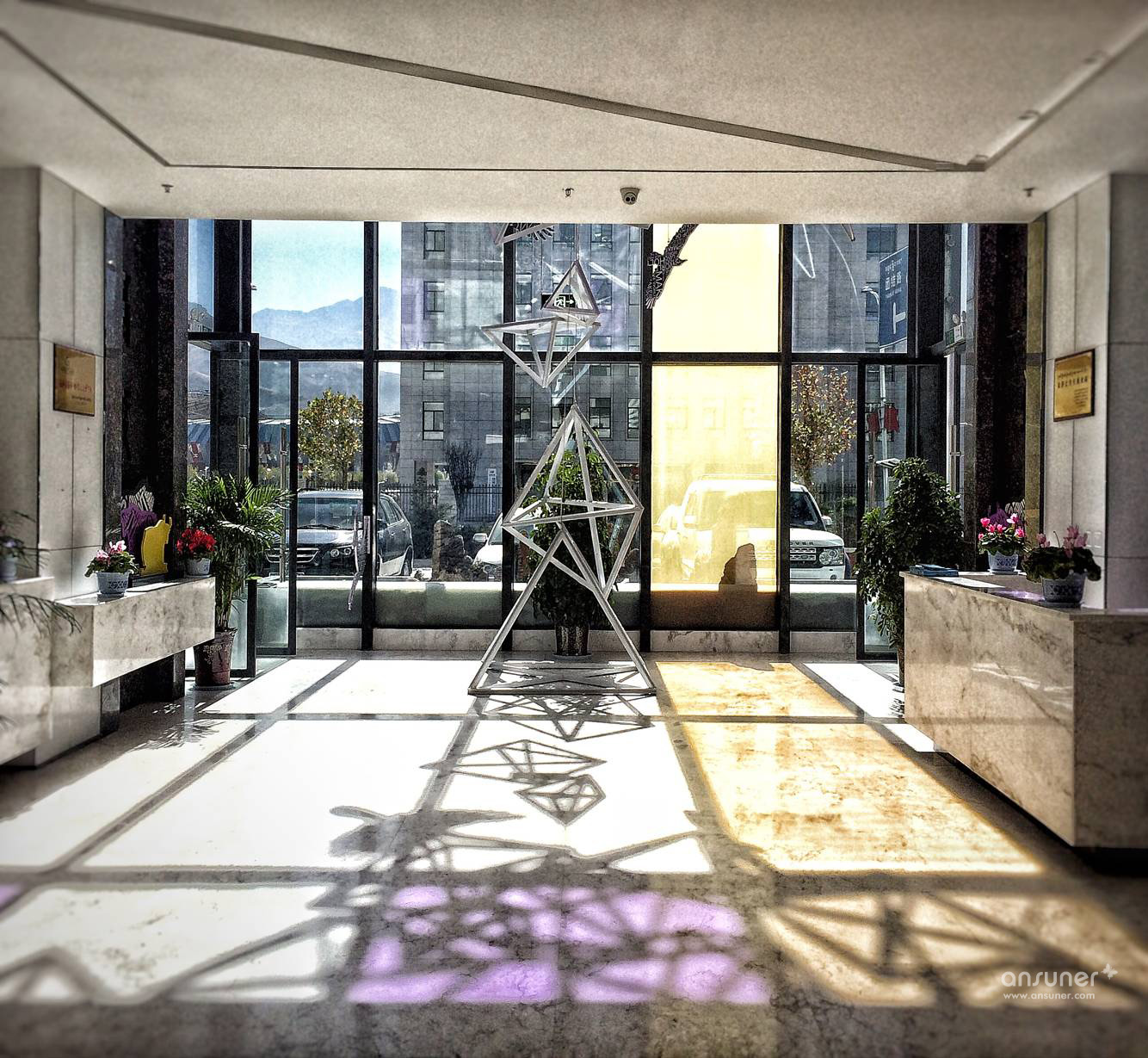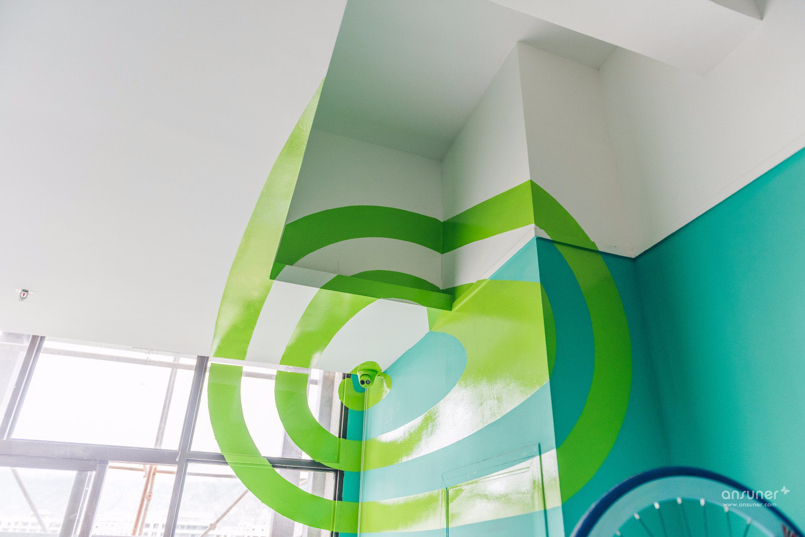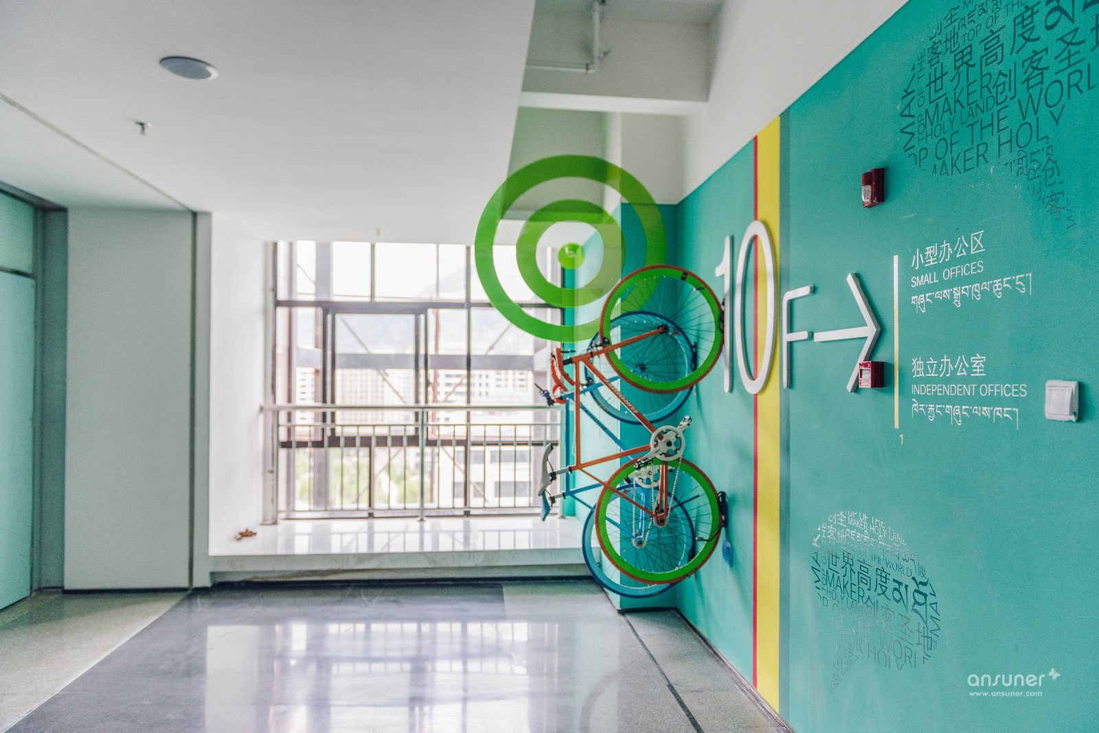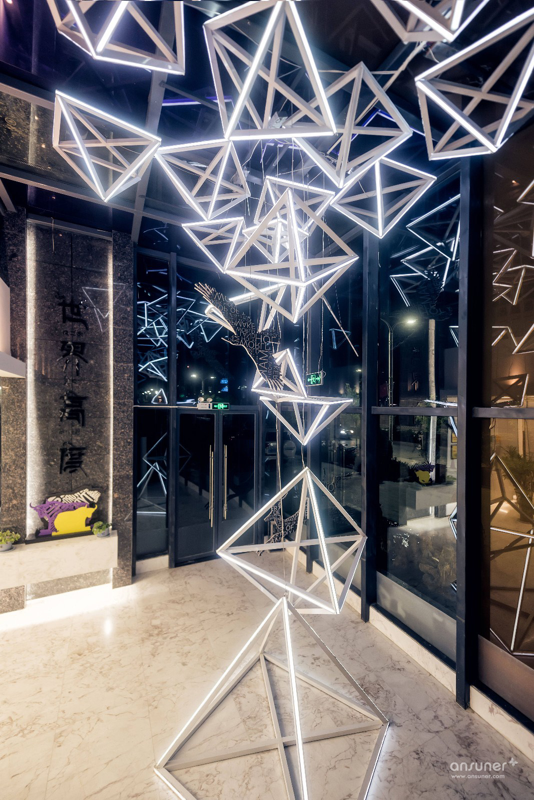 利用几何视觉错觉艺术,凸显众创空间独特化和年轻化。视幻只能在固定角度观看到整体图案,如果从其他角度观看,只能看到几何碎片。
