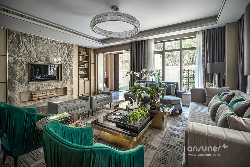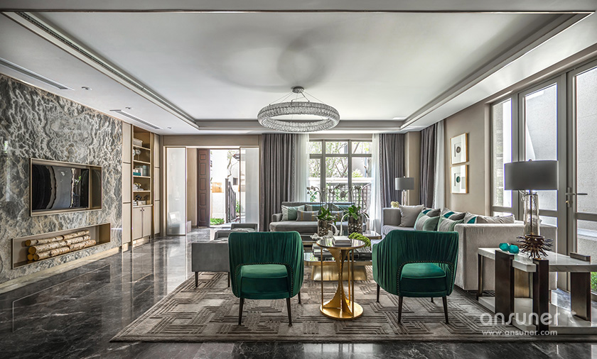“在我看来,文化的自信与东方设计的回归,不应该仅仅停留在符号、图案、款式、线条的表面异变......甚至,在艺术与审美上,东方和西方并非泾渭分明的。”她说:设计以玉石之王翡翠的色彩,应用于灰色的主调空间,以丰富的家居配饰元素、鲜明的色彩层次及质感的材料运用,呈现了浪漫、灵动的空间之美,让这个五层的别墅呈现了绝美风华。