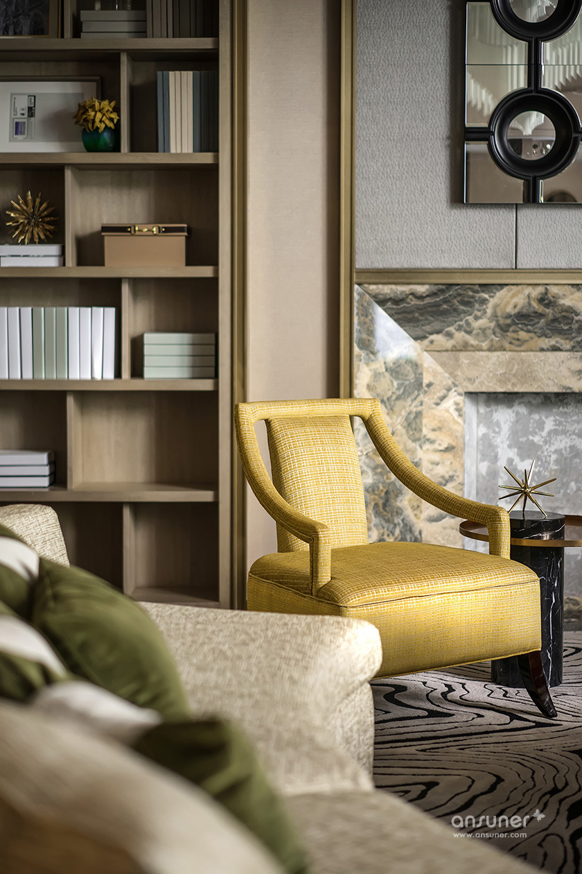 聚会厅的空间中,温润的黄翡色泽介入,材质的混搭与精致的工艺形成一场精心的铺排,简洁有力的设计语言,抽象的艺术画与精致雅趣的饰品在同一空间并置。