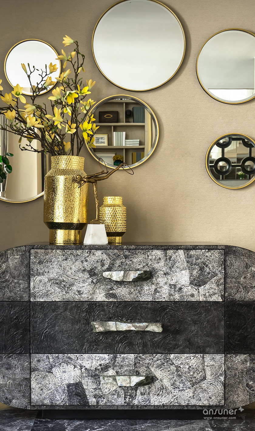 客厅与餐厅的设计中,高贵的气质在祖母绿与高级灰结合的刹那占领整个空间,在温润如玉的质感与盈透的色泽中,彰显着无与伦比的诱惑魅力。 她说:我想要让身处其间的人,在妙曼的视觉感受之后,发现有某些元素能够触碰我们内心的原点。