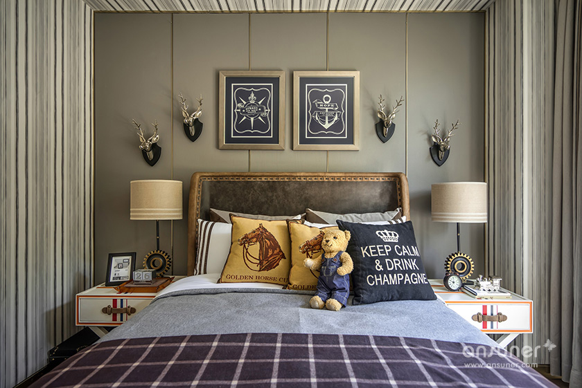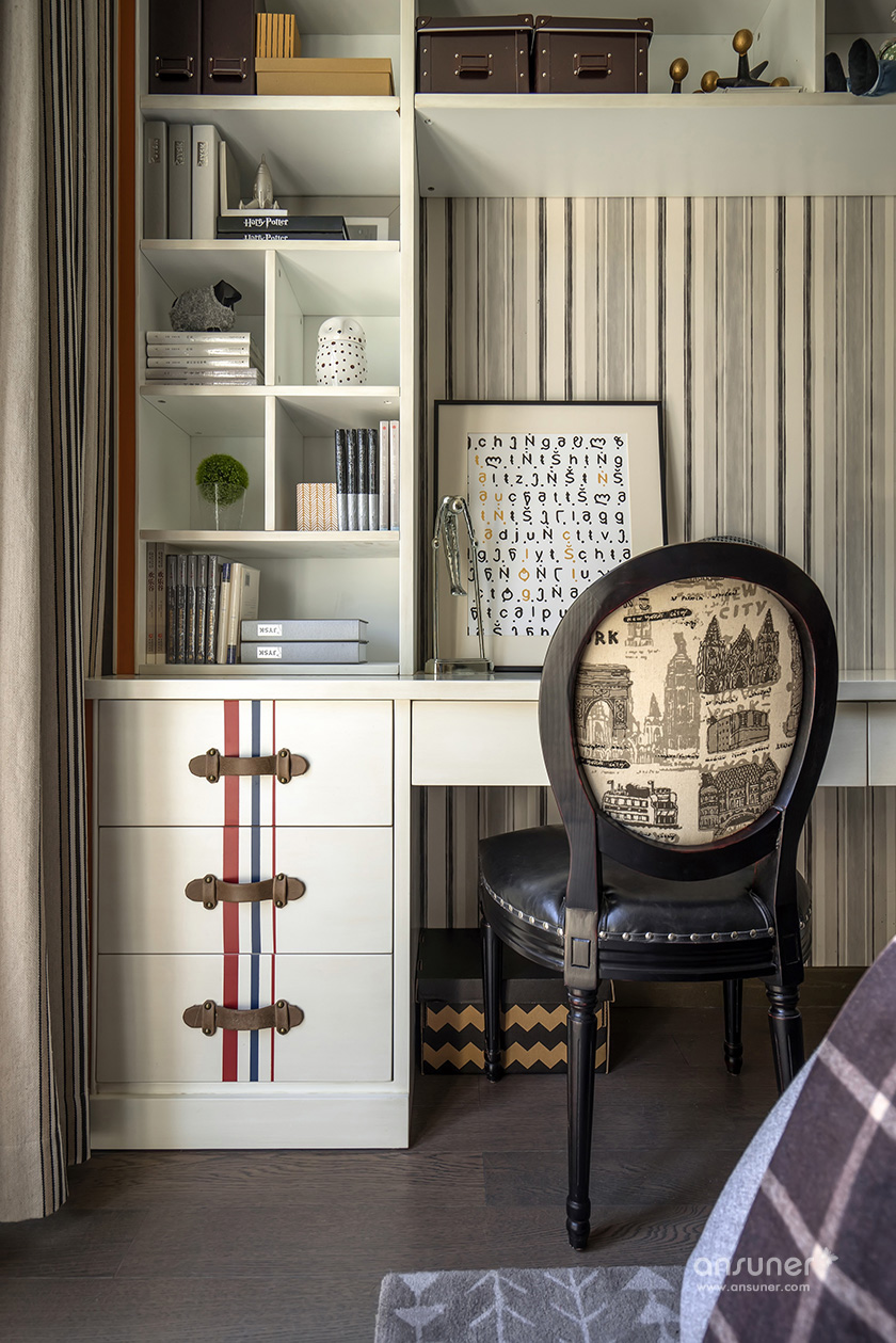 男孩房以精致的格纹与几何线条的延伸界定了空间的格调,欧洲建筑图案为背景的单椅和精心布置的艺术品,让空间更具情景化,纯真浪漫。