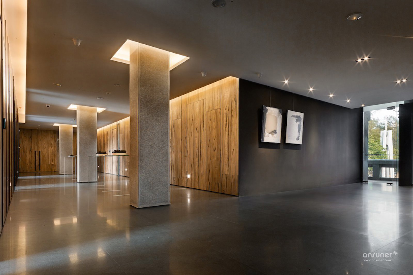 柱顶及长廊墙上的间接灯光溢流而下,柱子与墙的边界消失在天花板内。