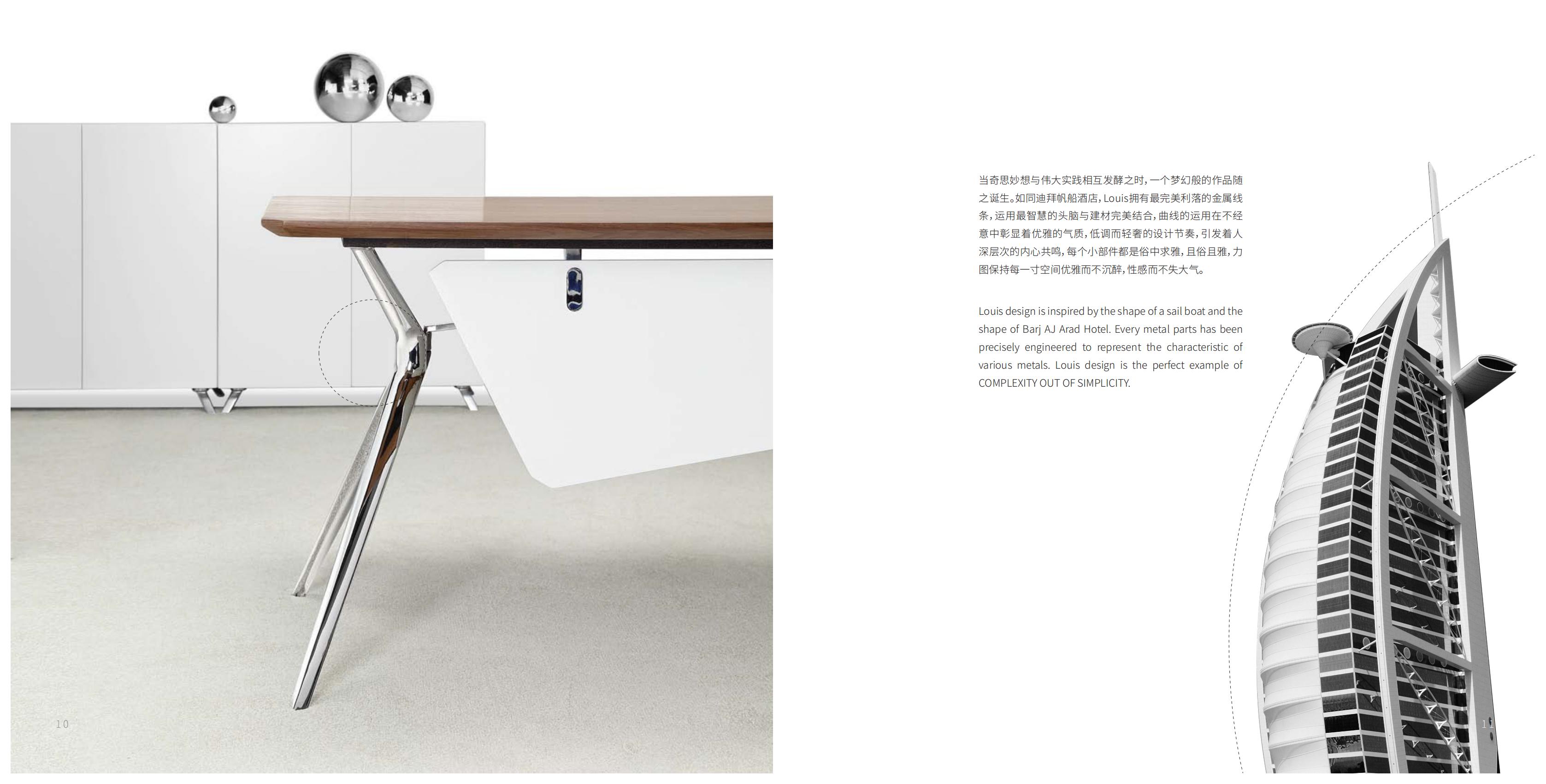 解构主义的完美实践--每一次新思想的出现总避免不了一些人的反抗,或者说总有人会有不同的看法。我们渴望拥有能贯彻自己品味的办公室,但却因使用属性、功能以及众口不一的审美而需要均衡。完美实践解构主义的精髓,以求探索寻求能够体现新的审美观念,突破固有的确定性,在细节与局部特征将个性的需求达到极致,一反简单、呆板、乏味的办公空间,将传统的办公空间提升为一种表达深层次的细节与美感结合的艺术之作。 当奇思妙想与伟大实践相互发酵之时,一个梦幻般的作品随之诞生。如同迪拜帆船酒店,Louis拥有最完美利落的金属线条,运用最智慧的头脑与建材完美结合,曲线的运用在不经意中彰显着优雅的气质,低调而轻奢的设计节奏,引发着人深层次的内心共鸣,每个小部件都是俗中求雅,且俗且雅,力图保持每一寸空间优雅而不沉醉,性感而不失大气。 社会越是信息化,就越是追求更新鲜更独立的形象。Louis以帆的棱角为灵感,采用不对称异型和反斜边设计。这种 形象更能诠释优雅的情感表达,性感而富有层次,从各个侧面带出了更多鲜活的时代意识,兼顾了独特的审美与大众的普遍意义。丰富多变的形态、表面材质和配套,深刻表达出当下的实际运用,并超越了固有对空间的理解。